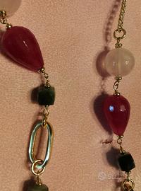 Collana in argento 925 dorato e pietre dure nei toni del rosa rosso catena gourmette con elementi ovali, chiusura a moschettone, fodera rosa, scatola e sacchetto marca. Lunghezza 75 cm. Mai indossata