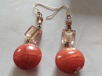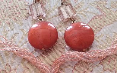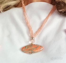 Vendo una parure di lavorazione artigianale con perle in vetro di Murano nei toni del rosa salmone, molto fresca e originale. La parure è composta da: 1 collana con fili di piccole perline dette "minuteria" e un bellissimo ciondolo di forma ovale 1 paio di orecchini per lobi forati con pendente lavorato a mano e varie screziature di colore. Questi gioielli sono nuovi: sono stati acquistati da un laboratorio di Murano per fare dei regali e mai usati. Altri modelli sul mio profilo!