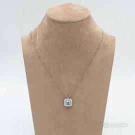 Collana in oro bianco 18 kt grammi 3,0 con un topazio azzurro di forma quadrata circondato da un doppio giro di zirconi di colore bianco. Il girocollo è firmato Fourline e la maglia è lunga cm. 41,5. Prodotto made in Italy munito di marchio di fabbrica come da legge e completo di confezione e certificato di qualità rilasciato dalla Gioielleria.