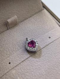 Vendo collana in oro bianco 18kt con pendente, composto da un rubino naturale taglio cuore da 0,55ct e contorno di diamanti da 0,18ct colore F purezza VVS.