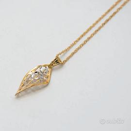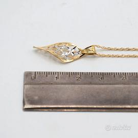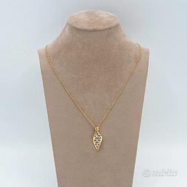 Collana in oro giallo 18 kt grammi 2,2. La maglia del girocollo è una singapore lunga cm. 44,5, il ciondolo ha una forma allungata con una lavorazione satinata su cui sono inseriti dei piccoli riporti in oro bianco 18 kt. Le dimensioni sono di cm. 2,8 compreso l’ anellino. Prodotto made in Italy munito di marchio di fabbrica come da legge e completo di confezione e certificato di qualità rilasciato dalla Gioielleria.