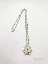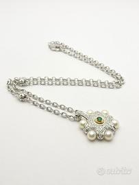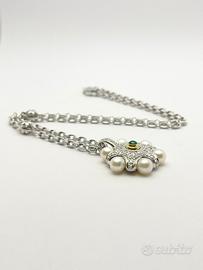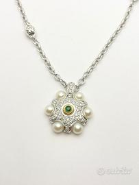 Collana in oro bianco e giallo 18 KT ( 750 ‰ ) di grammi 20.10 impreziosita da diamanti naturali forma tonda e taglio a brillante di ct 0.65 totali; purezza VVS colore H, perle coltivate e smeraldo naturale taglio cabochon. A scritta ZANCAN.