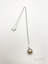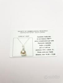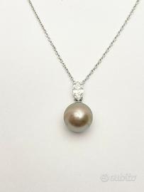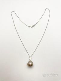 Collana in oro bianco 18 KT ( 750 ‰ ) di grammi 4.44 impreziosita da diamante naturale taglio a navette di ct 0.40; purezza VVS colore G e perla coltivata Tahiti di mm 10.50/11.00.