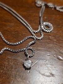Pendente a Cuore: Un piccolo ma delizioso pendente a forma di cuore, incastonato di una pietra (probabilmente un cristallo o zircone) sfaccettata, che aggiunge un punto luce elegante alla collana.