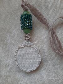 collana con ciondolo fatto interamente a mano, con perline in vetro, rivestito con tessuto e passamaneria.