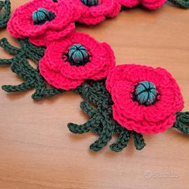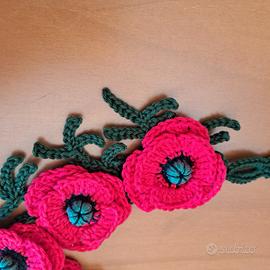 collana lavorata all'uncinetto con fiori di papavero e foglie verde scuro