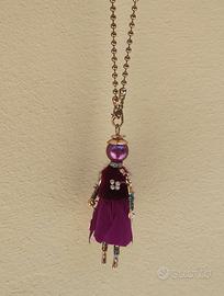 Testa a forma di perla iridescenti color malva/viola. Vestitino arricchito da soffici piume bordeaux/fucsia e un corpetto con un piccolo fiorellino di strass.