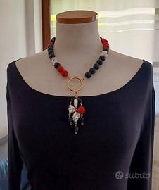Collana di media lunghezza colorata con ciondolo che può essere rimosso di pietre dure onice nera, giada rossa e perle barocche bianche. Senza ciondolo la collana va portata con la chiusura sul lato.