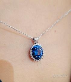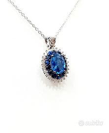 Collana e pendente a fantasia con Zaffiro ovale 0,75 ct con doppio giro di zaffiri e diamanti in Oro Bianco 3,88 gr - 18 kt - ( 750 )