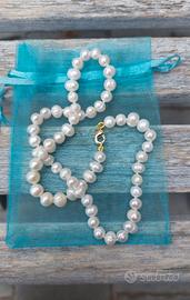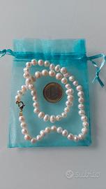 Collana girocollo a un giro realizzata con perle d'acqua dolce ** ( perle naturali di circa 6/7/8 mm,vedi foto per dimensione) e gancino in metallo placcato oro. 📌📌📌Lunghezza collana, compreso chiusura, cm 43.5📌📌📌 Consegno con sacchettino organza-Nuova ** perle naturali: differiscono tra loro per forma, dimensione e lucentezza.Non è un difetto ma caratteristica stessa del prodotto naturale