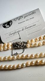 Vendo splendida collana di perle coltivate (136 perle da circa 7–7,5 mm), con elegante chiusura in oro bianco 18 kt arricchita da diamanti.
