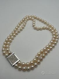 Meravigliosa collana di perle natuali akoya del Giapponese a doppio giro con chiusura in oro bianco massiccio 18 carati e 56 diamanti naturali sulla chiusura taglio brillante di caratura totale 1,20.