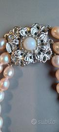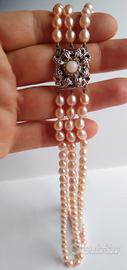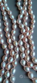 Collana di perle rosa ovali coltivate in acqua dolce annodate a mano, 3 fili = 51+55+63 perle. Fermaglio= bigiotteria. Dimensione della perla 6-7 mm. Lunghezza del filo più corto cm. 43.