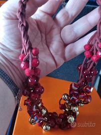 Bellissima collana con intrecci di pelle marrone e sfere in vetro rosso e dorato.