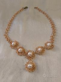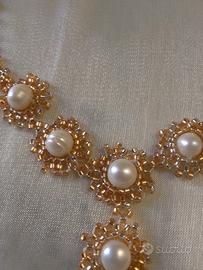 Questo è un gioiello di alta qualità, perfetto per cerimonie, sposa elegante e duraturo. È un pezzo unico, realizzato con una complessa tecnica Beadwork e materiali che ne giustificano il valore premium. Le perle sono vere Perle di Fiume (d'Acqua Dolce) e le perline decorative sono Miyuki originali di colore Oro, note per la loro precisione e l'alta qualità. La collana misura 44 cm ed è dotata di un moschettone in ottone per la chiusura. Perfetta se cerchi un gioiello elegante che si distingue dalla bigiotteria comune.