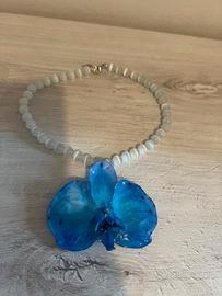 Collana di perle di occhio di gatto con Orchidea blu vera desidratata con il gel silica e poi lavorata con la resina.