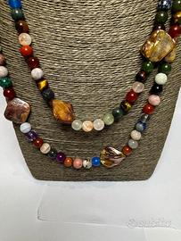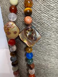 raffinata collana lunga (62 cm) realizzata interamente a mano con una selezione di pietre dure naturali e inserti organici. La collana è priva di chiusura metallica, infilata con metodo tradizionale a filo continuo che la rende estremamente piacevole da indossare.