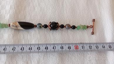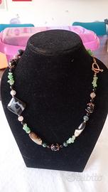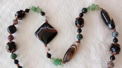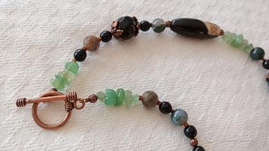 Lavorazione artigianale Pezzo unico Agata, avventurina e rame montati su cavetto di acciaio Lunghezza cm 52 circa Posso preparare su richiesta orecchini e bracciale a completare la parure Spedisco in sacchettino regalo Nel mio armadio trovate molti altri gioielli e accessori smartphone fatti da me con vari materiali Sono a disposizione per ulteriori informazioni, dettagli e foto