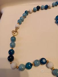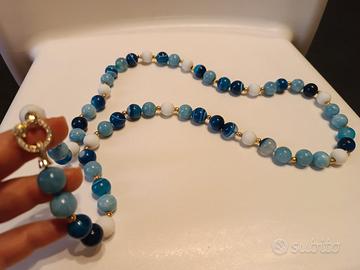 Stupenda collana lunga con agata blu striata ,azzurra e bianca di prima qualità , illuminata da intermezzi color oro.