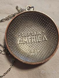 Ciondolo a forma di scudo di Captain America, un pezzo di merchandising ispirato al celebre supereroe della Marvel.