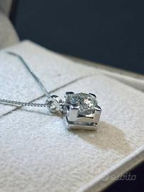 Vendo collana punto luce in oro bianco 18 kt dal peso complessivo di circa 3 grammi, con diamante naturale da 0.70 carati di colore G e purezza SI 1, taglio brillante. Il diamante presente sulla collana è certificato IGI con incisione al laser che lo collega al suo certificato.