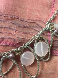 Gioiello fatto a mano: catena e anelli vintage color argento, elementi forme diverse in quarzo rosa e perle di fiume. Lunghezza regolabile. Peso 60 gr.
