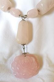 Collana in quarzo rosa con pendente a cammeo in raffinata lavorazione argento.