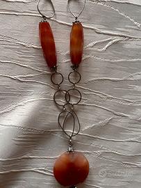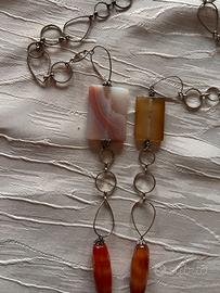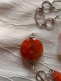 Collana in maglia bagnata d'argento con pietre dure (corniola e agata), lunghezza cm 52, modello unico assemblato a mano