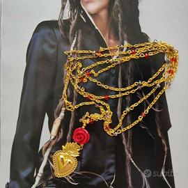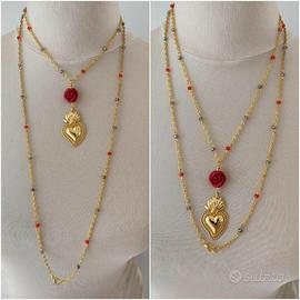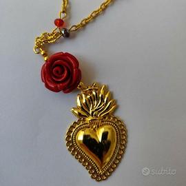 Maxi collana boho folk ex voto sacro . Rosario in luminosi cristalli taglio briolette alternata a texturixed twisted chain, maglia dorata diamantata molto luminosa. Ciondolo cuore sacro ex voto in ottone dorato e rosellina in resina.