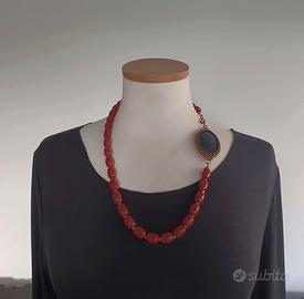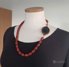 Collana asimmetrica di pasta di corallo rossa con cabochon nero di agata che funge d chiusura laterale più adatta per un abbigliamento casual autunnale e invernale-