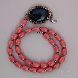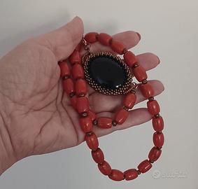 Materiali: barilotti di pasta di corallo rossa color mattone da 12 per 8 mm, distanziatori bronzati, cabochon di agata nera da 4 per 3 cm, moschettone, perline di vetro per l’incastonatura del cabochon.