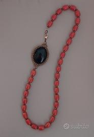La collana di media lunghezza è realizzata con pasta di corallo rossa tendente al colore mattone, arricchita da un esclusivo cabochon di agata nera laterale che fungendo da chiusura, dona un contrasto speciale.