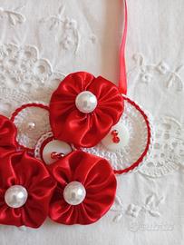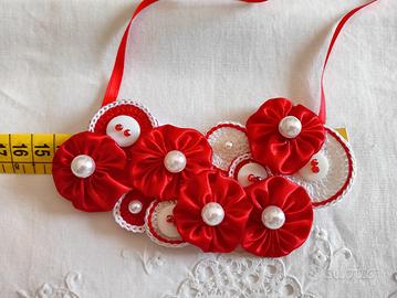 Collana realizzata a mano con yoyo in stoffa rossa, cerchietti all'uncinetto di varie dimensioni rosse e bianche su cui ho attaccato dei bottoni bianchi con piccole perline rosse. La collana si può regolare a piacere visto che il nastro rosso è lungo circa 50 cm. Per qualsiasi informazione non esitate a chiedere e soprattutto date un'occhiata anche agli altri miei manufatti. Grazie😉