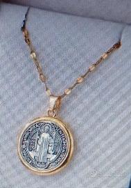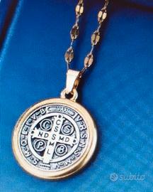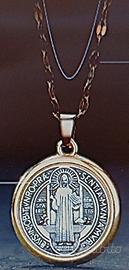 Bellissima collana con medaglietta di San Benedetto - Catena in stile a maglia sottile in lega, dorata