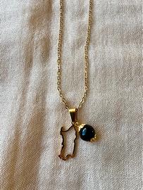 Collana dorata con ciondoli della Sardegna e su coccu, fatto a mano. Su coccu e un amuleto tipico della Sardegna, simbolo della protezione e della buona fortuna. Da custodire sempre con te. Ottima idea regalo! Nuovo. Cod. 1115.1