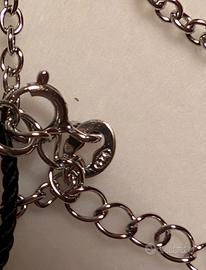 Splendida collana a catena lunga (stile sautoir) con motivi a quadrifoglio in madreperla bianca profili in argente con lavorazione perlee. Acquistata presso la storica Gioielleria Edvina Peraboni di Milano. Il design è elegante e senza tempo. La montatura è in argento 925 con una raffinata lavorazione pallinata sui bordi. Materiale: Argento 925 (punzone presente) e Madreperla naturale. Condizioni: Nuova, mai indossata (ancora con cartellino originale). Dettagli: Ogni quadrifoglio ha riflessi iridescenti tipici della madreperla naturale. Accessori: Venduta completa di scatola originale rossa firmata "Edvina Peraboni", perfetta per un regalo. Stile: Raffinato, ideale sia su un abito elegante che su un outfit casual chic.