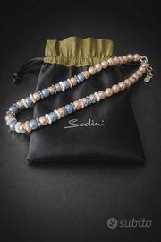 COLLANA SODINI CON PERLE E CRISTALLI NUOVA CON SACCHETTO ORIGINALE Bigiotteria - Gioielli – Collane Splendida collana firmata Sodini, dal design raffinato e contemporaneo, perfetta per aggiungere un tocco di eleganza e luminosità a qualsiasi outfit. Il monile è composto da perle sintetiche effetto perla naturale in tonalità rosa cipria, sfere decorative azzurro pastello con finitura lucida e distanziali impreziositi da cristalli luminosi. La collana rappresenta un equilibrio perfetto tra eleganza classica e stile moderno. Chiusura a moschettone con catena che permette di allungare la collana o di far scendere la catena pendente sulla schiena. Targhetta Sodini pendente. Possibilità di variare la lunghezza del monile da 41 a 46 cm Il gioiello è nuovo, mai utilizzato, ed è venduto completo di sacchetto originale con logo Sodini.