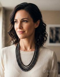 Elegante collana girocollo firmata Sodini Bijoux, caratterizzata da un design a 4 fili scalari che creano un bellissimo effetto volume sul decolleté. La combinazione di perle nere lucide e inserti in cristallo sfaccettato dona una lucentezza discreta ma sofisticata, virando su toni metallici simili all'ematite.
