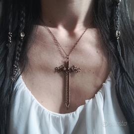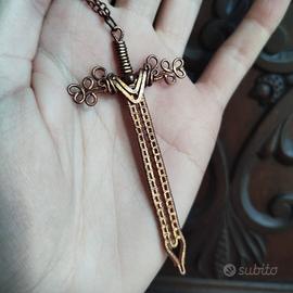Ciondolo a forma di spada realizzato a mano con la tecnica del wirewrapping. La base è realizzata con filo di rame anticato, gli intrecci sono in rame con rivestimento antiossidazione.