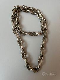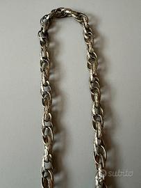 Collana Sterling Originale Anni 60. Mai utilizzata. Perfettamente conservata, in condizioni impeccabili. Collana maglie ovalio amaglie "Rolò", Questo stile è caratterizzato da maglie ovali o rotonde interconnesse, ed è un design comune sia nella gioielleria vintage. Il design è semplice e classico, con maglie spesse che conferiscono un aspetto robusto. Le maglie sono "forzatina" o "rolò" (a volte chiamata anche "belcher" in inglese) con una forma ovale e voluminosa. La forma specifica può essere descritta come "marinaretto". Collana girocollo regolabile con catena intrecciata robusta con insolite maglie ad incastro. Preziosa ed elegante. Bella da possedere, da indossare, ma anche, da regalare. Un pezzo unico. Introvabile. Bellissimo.