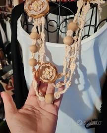 Collana artigianale boho chic in corda intrecciata color beige con grandi perle in legno naturale e fiori decorativi fatti a mano in tessuto e crochet.