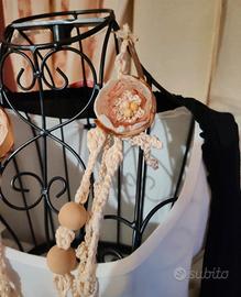 🌸 Dettagli: fiori in tessuto e crochet, perle grandi