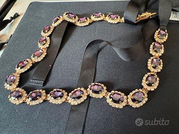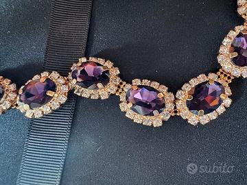 Bellissima collana bijoux di swarosky sfaccettati viola e brillanti montati su base dorata, molto lunga, elegante e luminosissima. Il nastro annodabile permette di adattare a collana alla misura desiderata in modo semplice e veloce. Utilizzabile anche come bracciale avvolgendo al polso più giri. Lunghezza dei cristalli: 50cm, lunghezza totale della collana: 150cm. Consegno a mano a PR, RE, MO, RN e località sul tragitto.