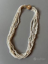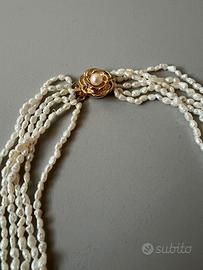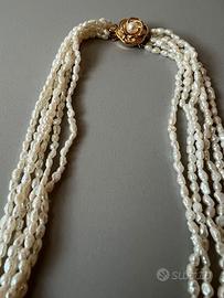 Collana Torchon perle vere di fiume Anni 50. Mai utilizzata. Perfettamente conservata, in condizioni impeccabili. A 6 fili, contrariamente alle più usate a 4 o 5 fili. Collana di perle d'acqua dolce a più fili, caratterizzata da una chiusura color oro con un design floreale. Le perle sono di forma barocca o "a chicco di riso", irregolari e piccole, caratteristica tipica delle perle d'acqua dolce. Presenta una caratteristica chiusura color oro a forma di fiore, spesso chiamata "susta". Preziosa ed elegante. Bella da possedere, da indossare, ma anche, da regalare. Un pezzo unico. Introvabile. Bellissimo.