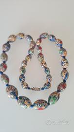 vendo collana vintage in pasta di vetro opaco dii Murano lunghezza 54 cm,con 32 perle ovali di diverse dimensioni stile Millefiori. La lavorazione manuale rende ogni perla unica. Si presenta in buone condizioni, solo una perla, evidenziata in una fotografia, presenta un foro su un lato
