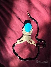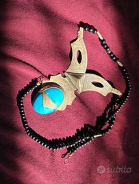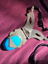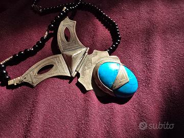 Indossare questa collana significa portare con sé un frammento di storia del deserto del Sahara. Si tratta di un pezzo di artigianato Tuareg autentico, caratterizzato da un pendente imponente con una grande pietra turchese centrale, la cui tonalità vibrante contrasta con il metallo inciso a mano. Il pendente presenta i classici motivi geometrici della cultura nomade, con la particolare struttura a cerniera che ne sottolinea la lavorazione manuale. Le incisioni a punta di diamante e le linee parallele raccontano simbolicamente il legame di questo popolo con le stelle e le dune del deserto. L'oggetto non è nuovo di fabbrica e riporta con orgoglio i segni del tempo e del vissuto: la patina del metallo e le piccole irregolarità della pietra non sono difetti, ma testimonianze autentiche di un pezzo che è stato parte di una cultura e di una storia reale. La collana è completata da un filo di palline nere che ne esalta l'eleganza austera. Si tratta di una proposta rivolta a chi sa riconoscere il valore degli oggetti non seriali: il prezzo a cui viene proposta è volutamente molto contenuto e già ben al di sotto delle normali quotazioni di mercato per questi monili, proprio per favorire chi desidera un pezzo autentico a una cifra accessibile. È un accessorio perfetto per chi cerca uno stile di design ricercato o un regalo dal forte impatto simbolico per collezionisti di arte Sahariana. Disponibile per consegna a mano a Reggio Emilia o spedizione tramite il servizio sicuro di Subito.it.