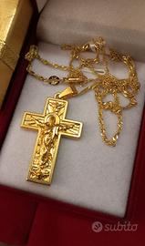 Vendo collana unisex tripla placcatura ORO18K GOLDFILLED lunghezza cm60, lavorazione onda d'acqua con pendente sacro di crocifisso, acciaio dorato,misure larghezza cm1,6 e altezza cm 4,5 . Invio in scatola regalo con incluso utile panno lucidagioielli.