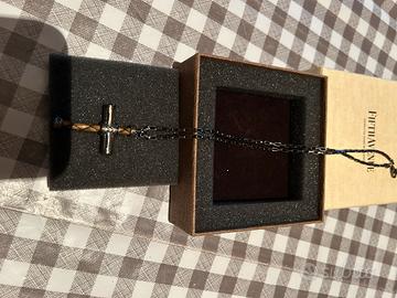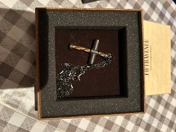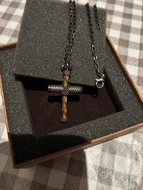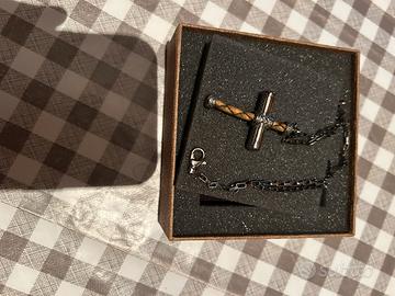 Collana uomo FIFTH AVENUE a Catena in Argento 925 brunito con Croce in cuoio marrone e Argento. Confezione originale.