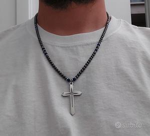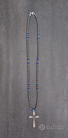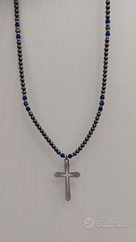 Nuova collana in perline di pietra di ematite grigia lucida e calcedonio blu con inserti di rondelle in acciaio inox color argento. Tutte le componenti sono in acciaio, compresi filo interno, gancio e croce (non si ossidano).