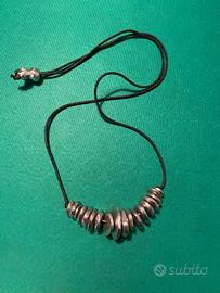 Collana Vestopazzo con cordino nero regolabile e 18 ciondoli sfere piatte irregolari in alluminio con palline di alluminio per regolare la lunghezza.